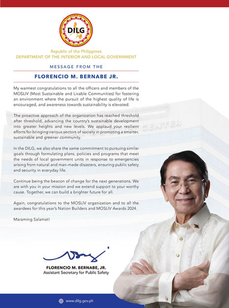 I likewise congratulate the distinguished awardees of the Nation Builders & Most Sustainable and Livable Community (MOSLIV) Awards. Your efforts have truly enhanced the lives of the Filipino people, filled in the gaps of our crucial sectors, and boosted the competitiveness of our cities. Bear in mind that you help shape the growth trajectory of our nation so it is only fitting that we consolidate our strengths to conserve our natural resources, provide equitable opportunities, and look after the well-being of our citizenry.