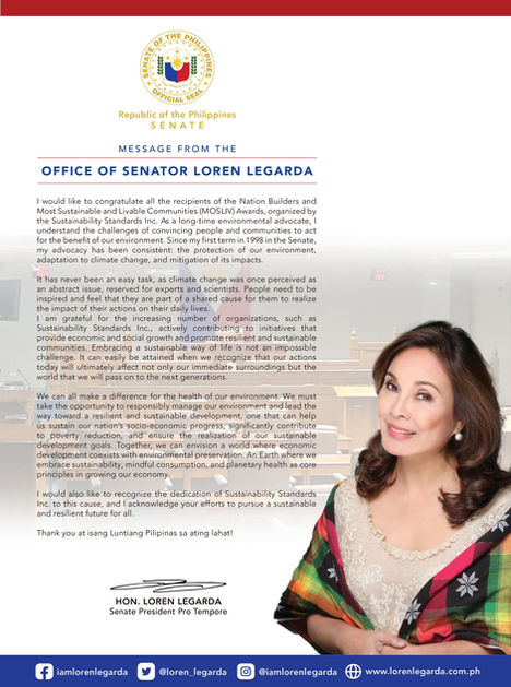 “As a premier organization centered on charting a path of progress and resilience, Sustainability Standards, Inc. continues to champion the integration of principles for a smarter, healthier, and greener community. The President likewise congratulates the distinguished awardees for their efforts enhancing the lives of the Filipino people, boosting the competitiveness of their province, district, cities, municipalities and communities. He also emphasized the importance of growth trajectory, equity and conservation of natural resources, providing equitable opportunities and well-being of our citizens. His administration is committed in achieving the United Nations Sustainable Development Goals and to promote public awareness on the significance of a whole-of-nation approach in confronting issues of climate change by enjoining everyone from policy making, devise inclusive solutions, participate in civic programs, and practice responsible consumption of energy.” – Philippine President Ferdinand R. Marcos, Jr., said in a message.